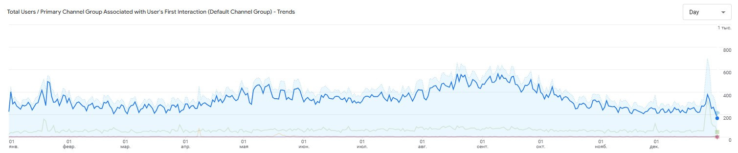 • збільшення органічного трафіку за період просування останній рік можна побачити на скріншоті з Аналітики з 250 до 500 користувачів в день.