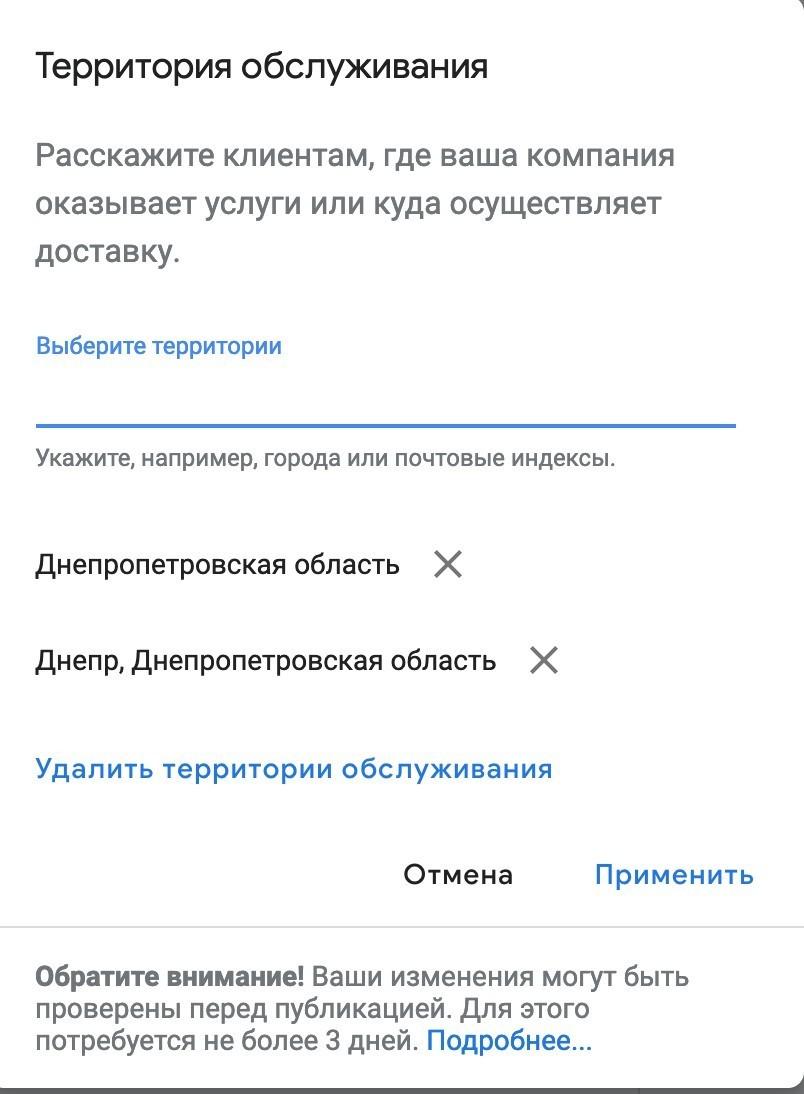 К примеру, если ваша компания занимается доставкой цветов в Киеве, стоит указать только город Киев. Ваша фирма будет отображаться только в Киеве, и не будет отображается, например, в Киевской области. Это исключит нецелевые обращения, а также нецелевые переходы на ваш сайт (что отрицательно сказывается на поведенческих факторах сайта).