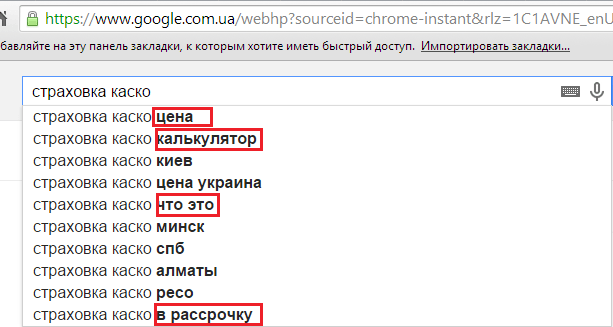 - Наиболее простой вариант сбора информации о наиболее часто используемых поисковых запросах – это просмотр подсказок в Googleи Яндекс системах. Начиная вводить основную ключевую фразу, можно увидеть под строкой ввода некоторое количество подобных слов, только в разных вариация. Все они – и есть необходимые ключевые фразы.
