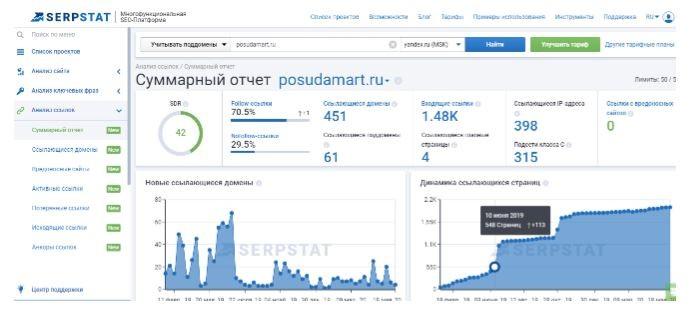 - Serpstat – покажет соотношение входящих к исходящим ссылкам. Для этого есть соответствующий раздел, где также указано, на какие сайты ссылается донор.