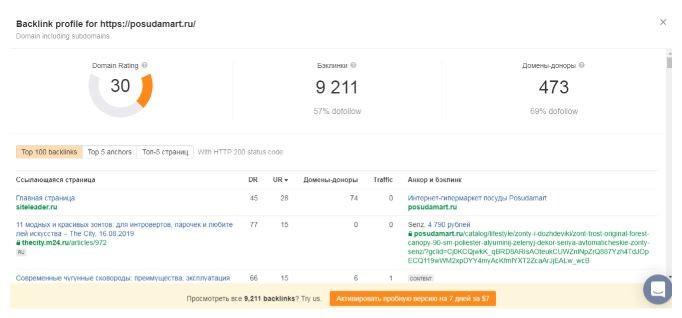 С его помощью можно посмотреть тип бэклинков, даты их индексации, актуальность. Для проверки функционала можно выбрать демо-режим на 7 дней. По его окончанию тариф стоит более 200 долларов в месяц.