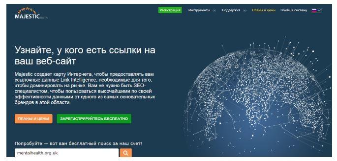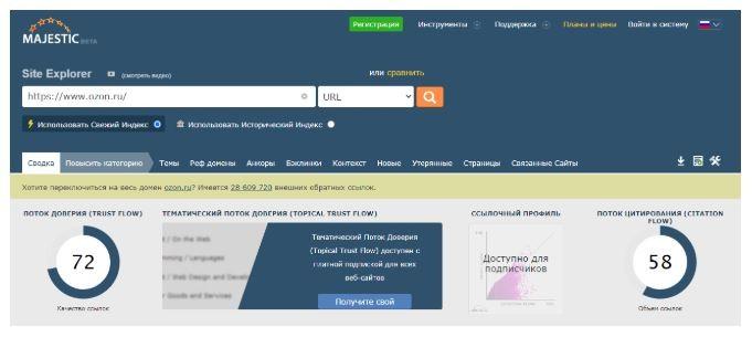 - Majestic– проверяет траст сайта, проводит ккомплексный анализ ссылочной массы, помогает быстро найти хорошие веб-сайты и отследить динамику продвигаемого ресурса.