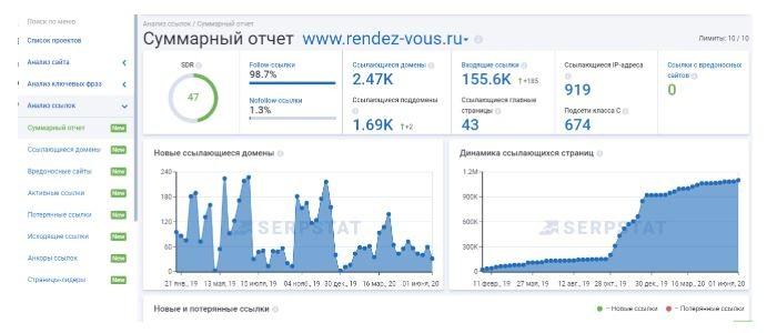 - Serpstat – покажет соотношение входящих к исходящим ссылкам. Для этого есть соответствующий раздел, где также указано, на какие сайты ссылается донор.