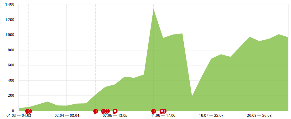 Взрывной рост связан с подключением ссылочного блока работ (плавный прирост обратных ссылок с тематических ресурсов собранных из ссылочных профилей прямых конкурентов)*MIN показатель трафика: