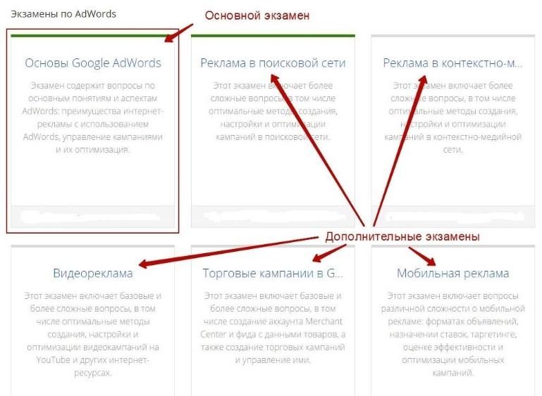 Прежде чем получить Google Adwords сертификат, нужно будет выбрать интересующее вас направление и соответствующий экзамен. На изображении ниже вы можете детальнее ознакомиться с их перечнем.