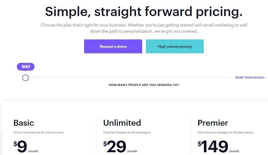 Сервис, услугами которого пользуются такие компании как Disney и Columbia, однозначно заслуживает внимания опытных маркетологов. Идеальные возможности для старта — 2500 подписчиков и 12500 писем бесплатно! Далее идёт стартовый тариф за 10 долларов. (для 500 подписчиков и уже без ограничения по письмам).