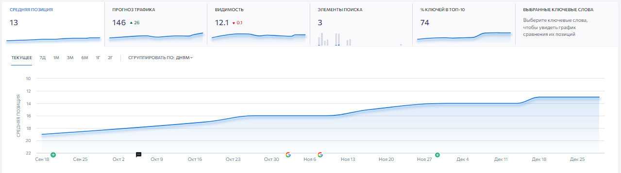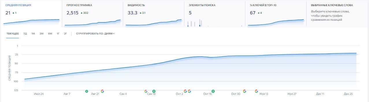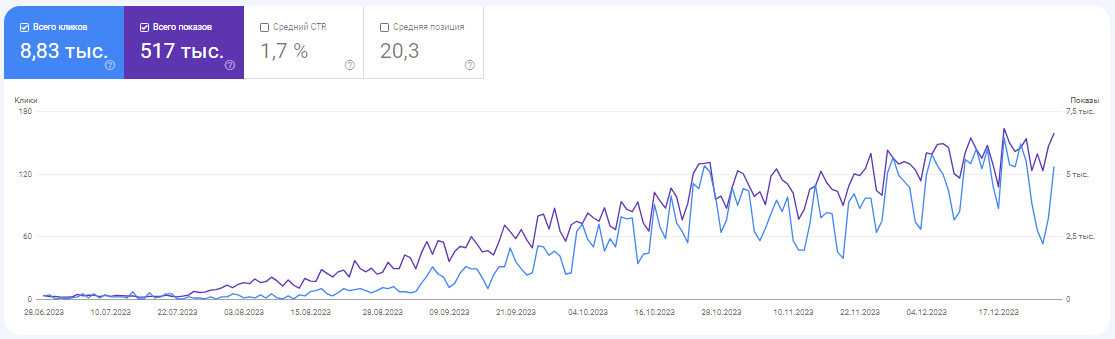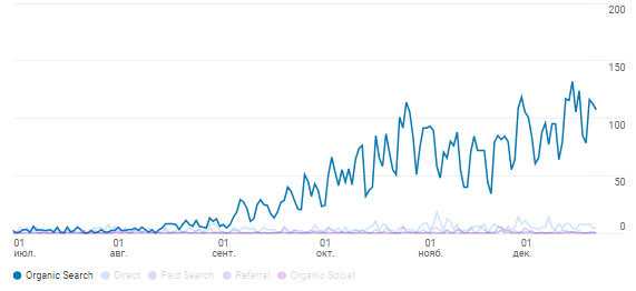 На старте проект был фактически без структуры и не получал трафик, SEO-показатели были очень слабые. За счет проведения комплекса работ по оптимизации, расширению структуры, запуску контент-плана и внедрения бэклинк-стратегии, имеем стремительное развитие сайта, проект получает должный рост в органике, а наша команда — положительный фидбек от клиента.