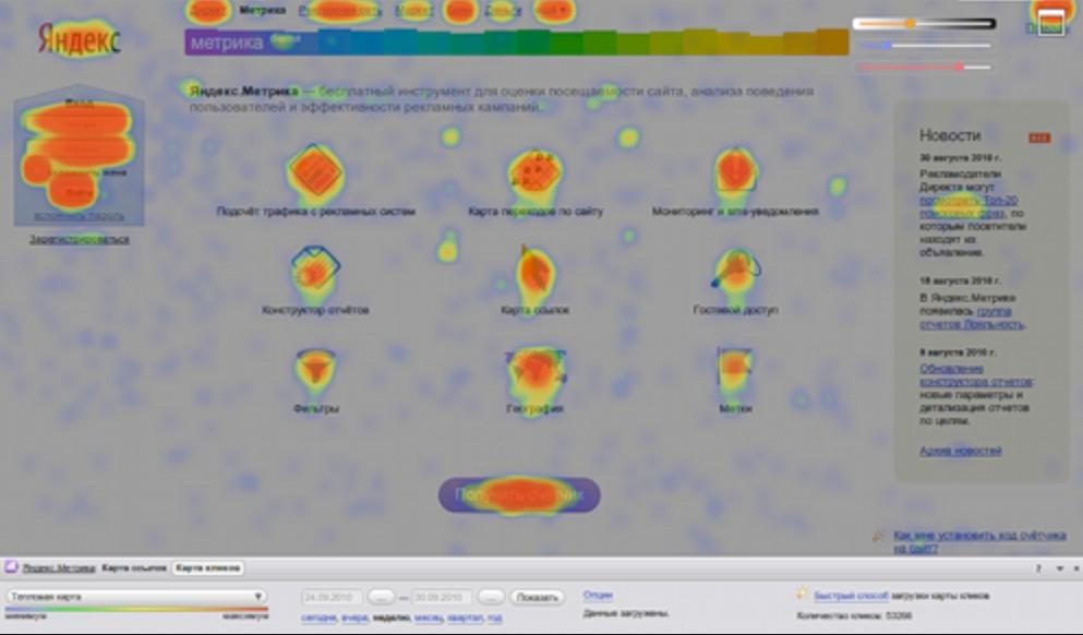 - Карта кликов. Инструмент, отображающий пользовательские клики на странице сайта (не обязательно по ссылкам). Формируется в виде «тепловой» карты.