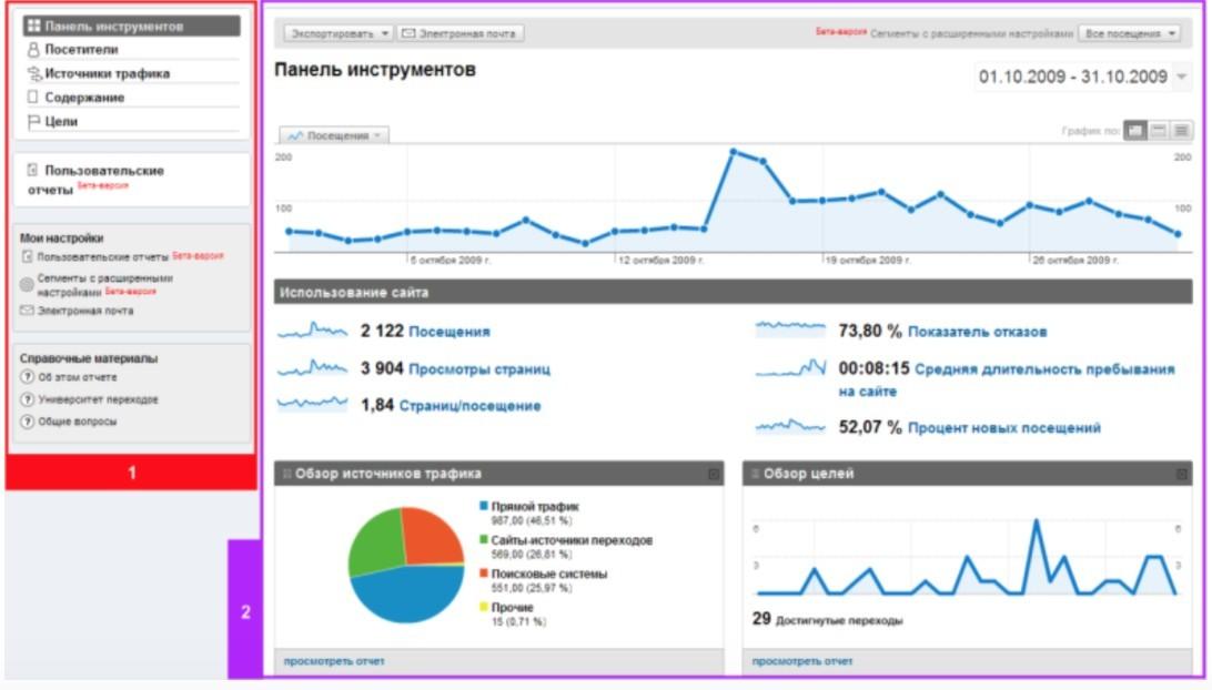 2. Google Analytics. Это главная площадка для сбора веб-аналитики, которая выдает информацию о данных посетителей, количестве проведенного на сайте времени, источнике трафика и пр. Возможен сбор данных за период для сравнения.