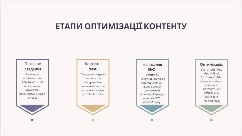 Тексти пишуться з урахуванням LSI, відповідності пошуковим інтенціям і кращих практик SEO-копірайтингу. - Оптимізація: